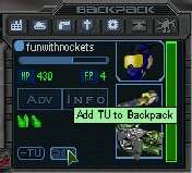 Go to the Nerve Center paddock or go inside the Nerve Center. Hit the "TU+" button on the bottom right of your display (next to your Avatar portrait). This will store Transium Units into your backpack. You may also go close to a Transium Well or Transium Silo that you own and drag the Transium icons back and forth between the Avatar portrait and the Well or Silo.